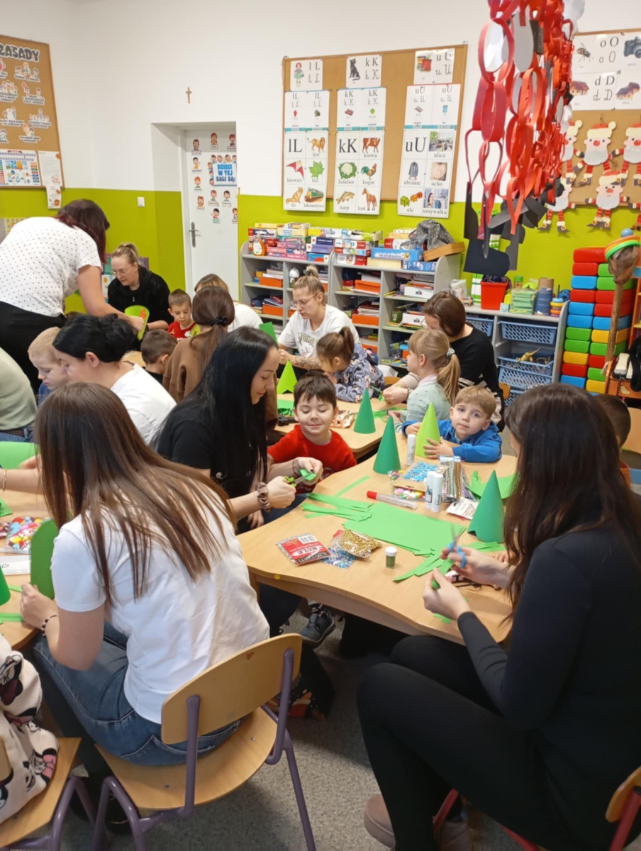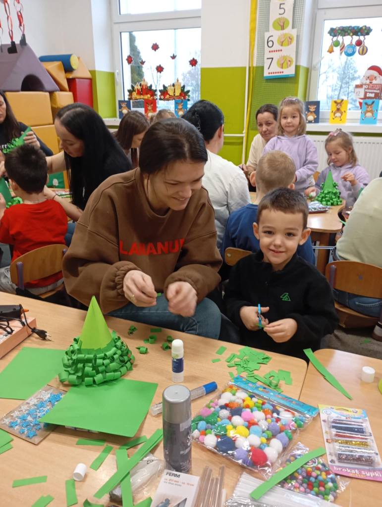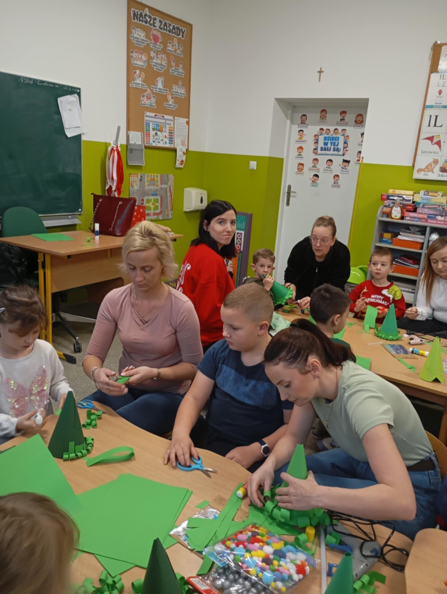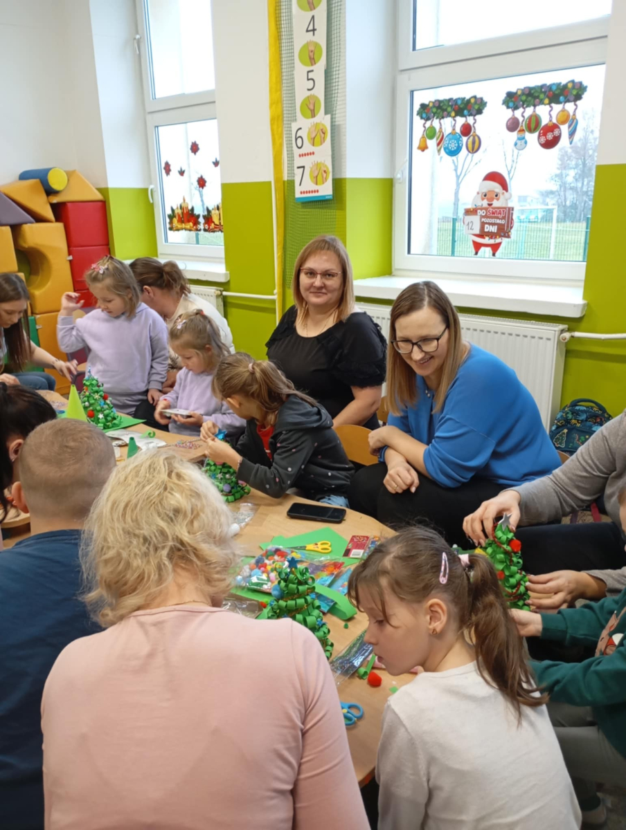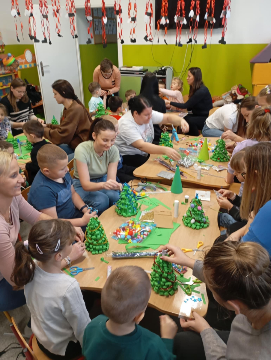 Dziś w naszej szkole odbyły się wyjątkowe warsztaty bożonarodzeniowe, w których udział wzięli rodzice wraz z dziećmi z grup przedszkolnych. Było to piękne spotkanie, pełne uśmiechu, twórczej pracy i świątecznego nastroju. Podczas warsztatów uczestnicy wspólnie wykonywali choinki świąteczne, które następnie stały się wspaniałą ozdobą naszych sal klasowych. Każda praca była niepowtarzalna i odzwierciedlała kreatywność oraz zaangażowanie zarówno dzieci, jak i dorosłych. Celem warsztatów było wzmacnianie więzi rodzinnych oraz budowanie wspólnych, wartościowych wspomnień. Takie inicjatywy dają możliwość spędzenia czasu razem, łącząc dobrą zabawę z rozwijaniem wyobraźni i zdolności manualnych. Czas spędzony podczas warsztatów upłynął w miłej i radosnej atmosferze, a świąteczny klimat towarzyszył nam od pierwszych chwil. Dziękujemy wszystkim uczestnikom za obecność, zaangażowanie i wspólnie stworzoną, magiczną atmosferę zbliżających się Świąt Bożego Narodzenia.