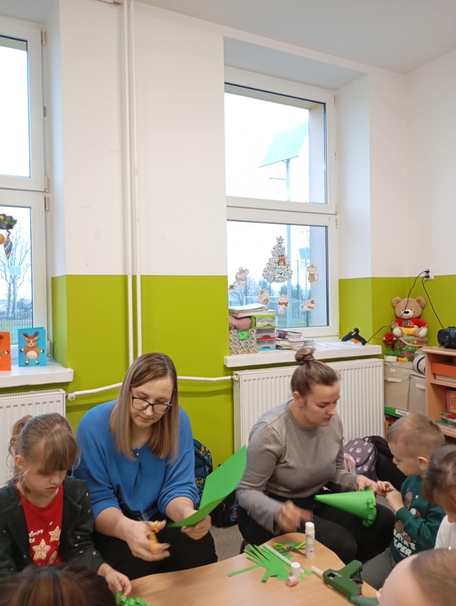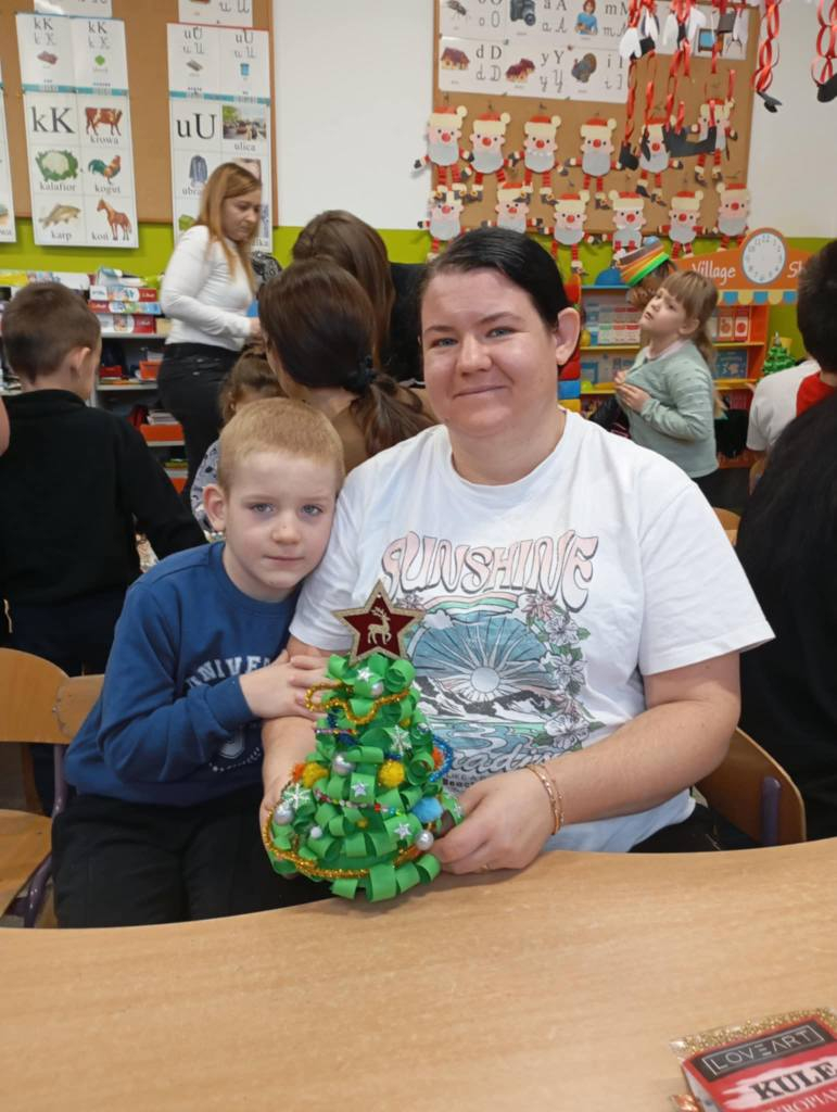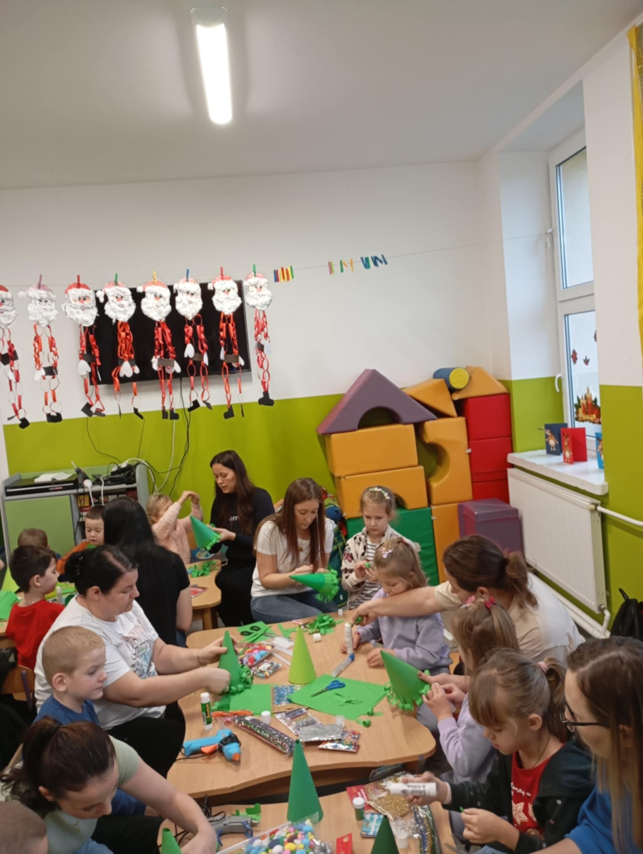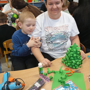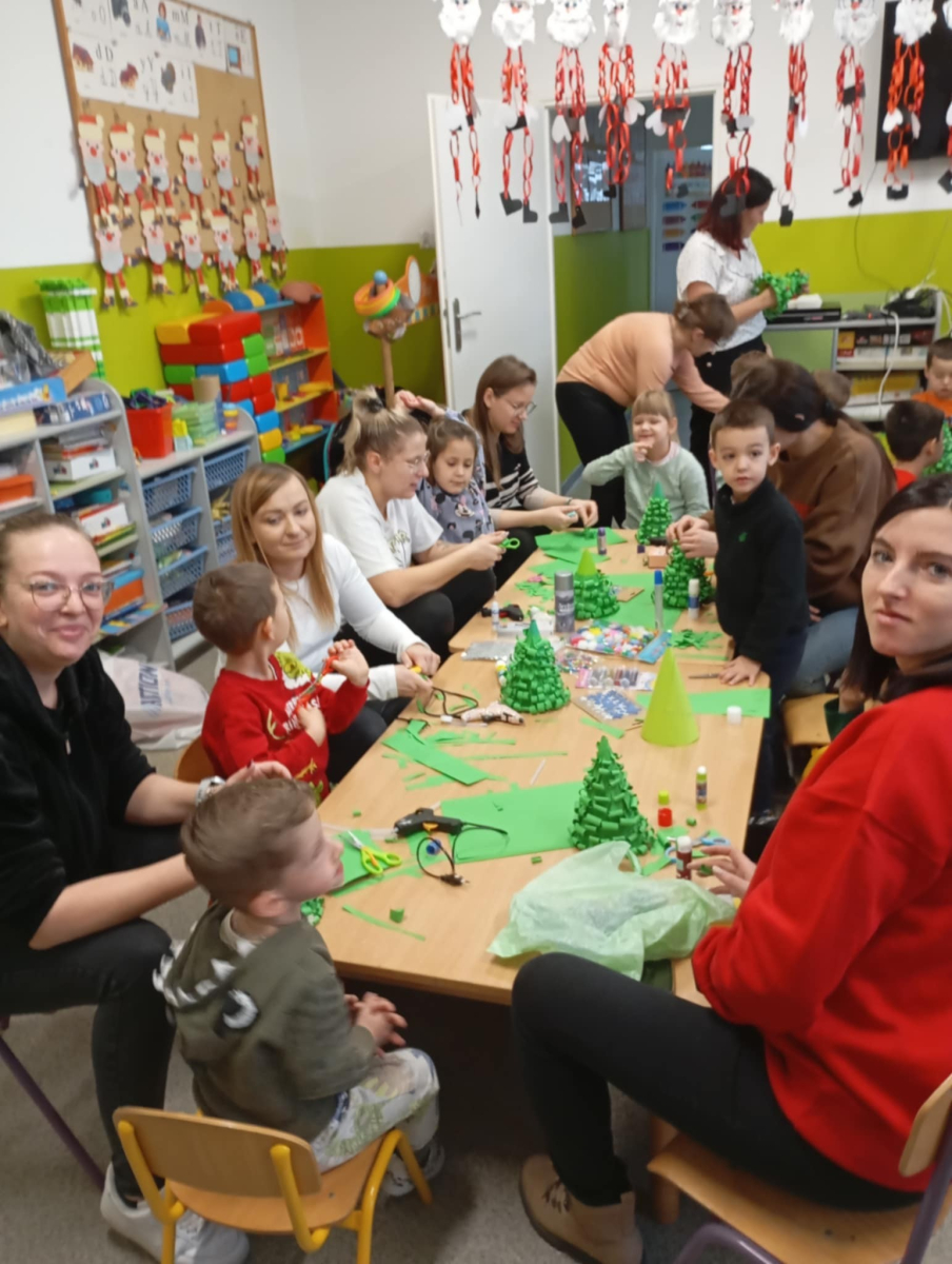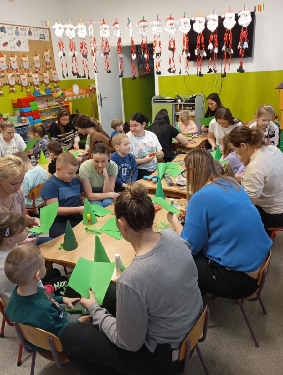 Dziś w naszej szkole odbyły się wyjątkowe warsztaty bożonarodzeniowe, w których udział wzięli rodzice wraz z dziećmi z grup przedszkolnych. Było to piękne spotkanie, pełne uśmiechu, twórczej pracy i świątecznego nastroju. Podczas warsztatów uczestnicy wspólnie wykonywali choinki świąteczne, które następnie stały się wspaniałą ozdobą naszych sal klasowych. Każda praca była niepowtarzalna i odzwierciedlała kreatywność oraz zaangażowanie zarówno dzieci, jak i dorosłych. Celem warsztatów było wzmacnianie więzi rodzinnych oraz budowanie wspólnych, wartościowych wspomnień. Takie inicjatywy dają możliwość spędzenia czasu razem, łącząc dobrą zabawę z rozwijaniem wyobraźni i zdolności manualnych. Czas spędzony podczas warsztatów upłynął w miłej i radosnej atmosferze, a świąteczny klimat towarzyszył nam od pierwszych chwil. Dziękujemy wszystkim uczestnikom za obecność, zaangażowanie i wspólnie stworzoną, magiczną atmosferę zbliżających się Świąt Bożego Narodzenia.
