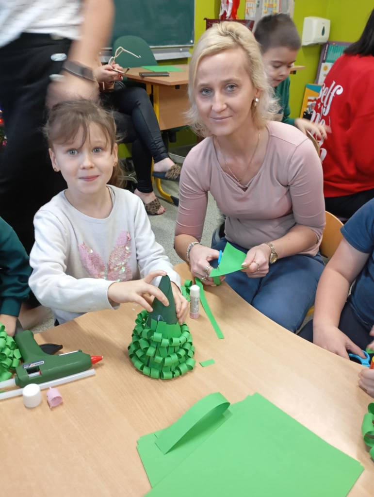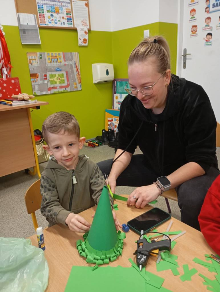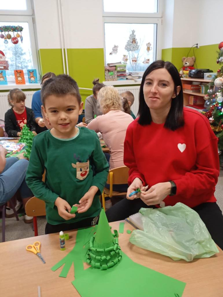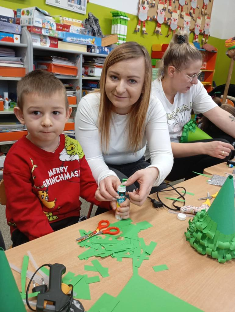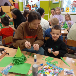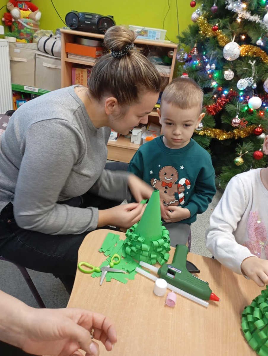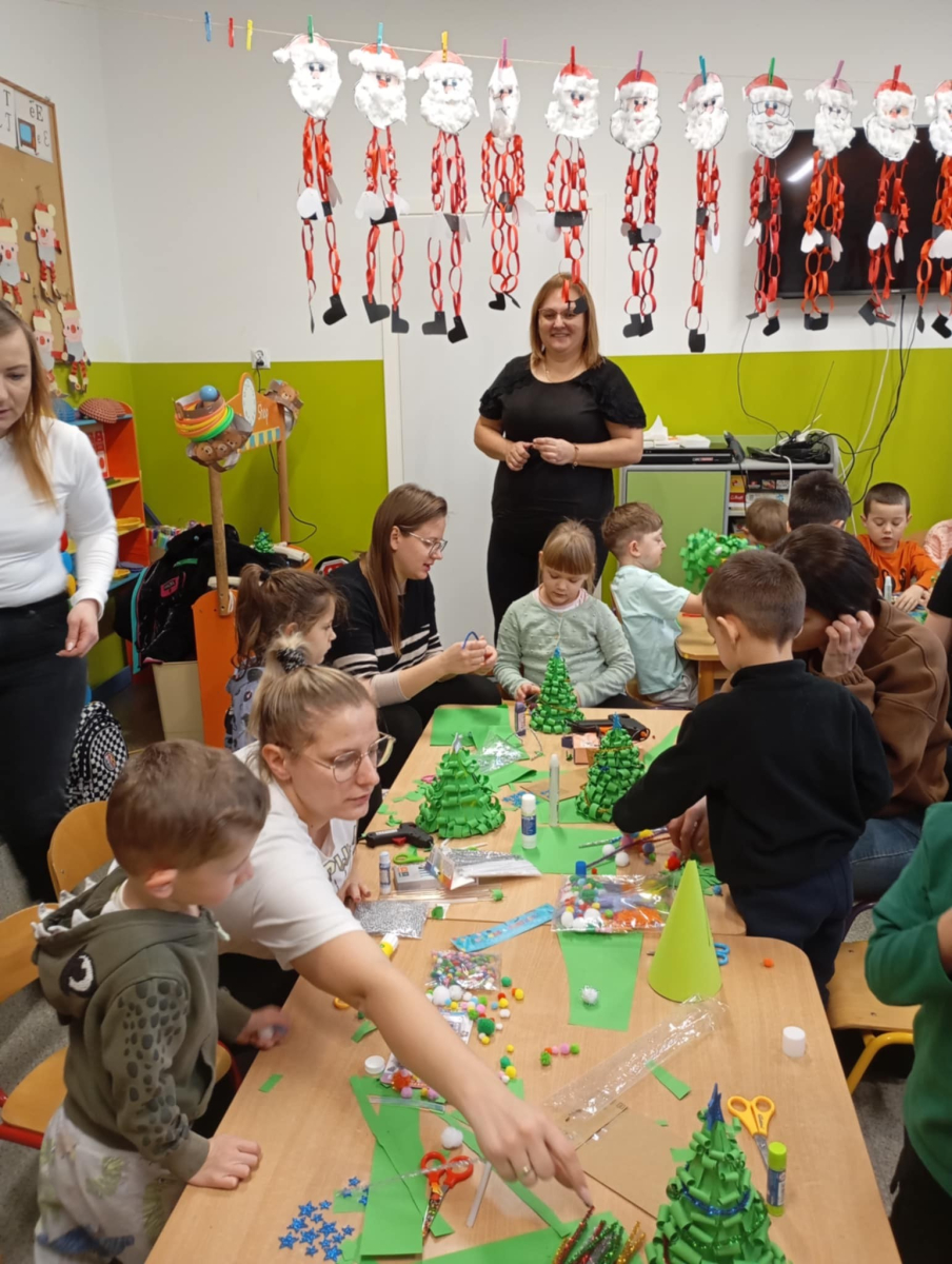 Dziś w naszej szkole odbyły się wyjątkowe warsztaty bożonarodzeniowe, w których udział wzięli rodzice wraz z dziećmi z grup przedszkolnych. Było to piękne spotkanie, pełne uśmiechu, twórczej pracy i świątecznego nastroju. Podczas warsztatów uczestnicy wspólnie wykonywali choinki świąteczne, które następnie stały się wspaniałą ozdobą naszych sal klasowych. Każda praca była niepowtarzalna i odzwierciedlała kreatywność oraz zaangażowanie zarówno dzieci, jak i dorosłych. Celem warsztatów było wzmacnianie więzi rodzinnych oraz budowanie wspólnych, wartościowych wspomnień. Takie inicjatywy dają możliwość spędzenia czasu razem, łącząc dobrą zabawę z rozwijaniem wyobraźni i zdolności manualnych. Czas spędzony podczas warsztatów upłynął w miłej i radosnej atmosferze, a świąteczny klimat towarzyszył nam od pierwszych chwil. Dziękujemy wszystkim uczestnikom za obecność, zaangażowanie i wspólnie stworzoną, magiczną atmosferę zbliżających się Świąt Bożego Narodzenia.
