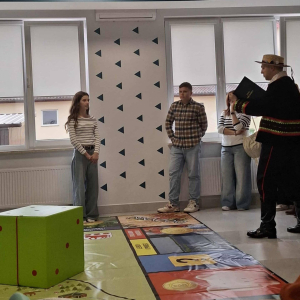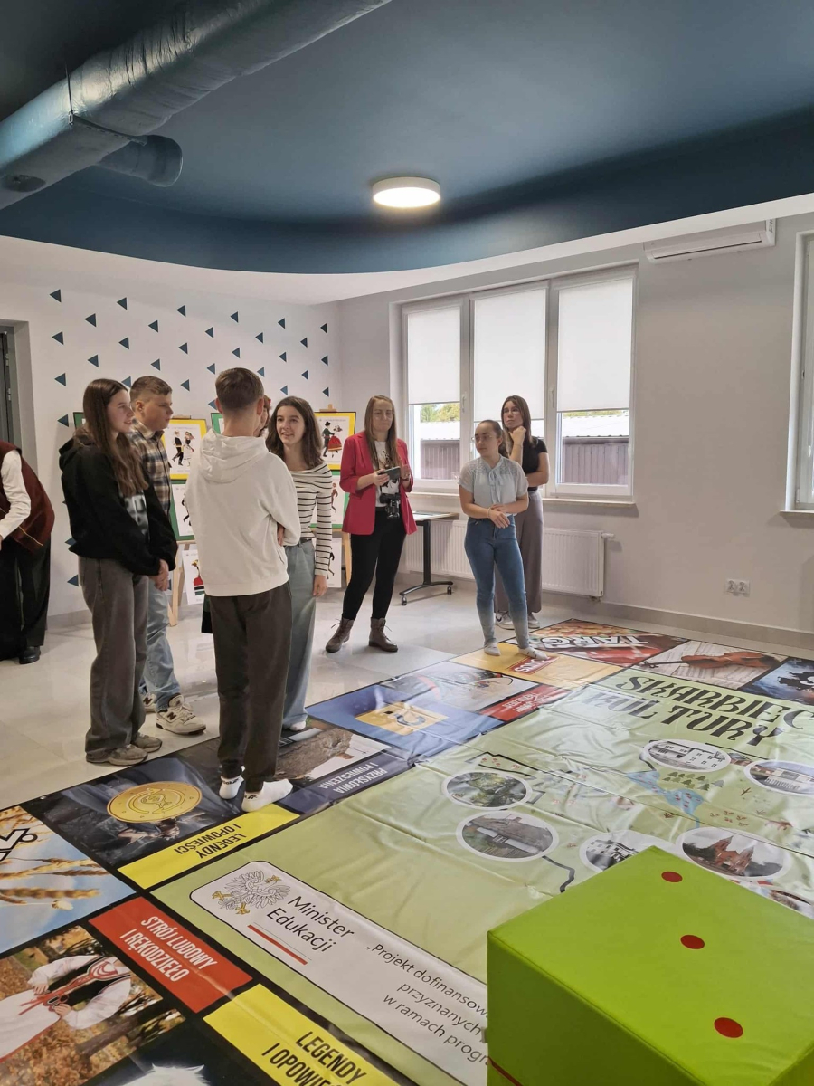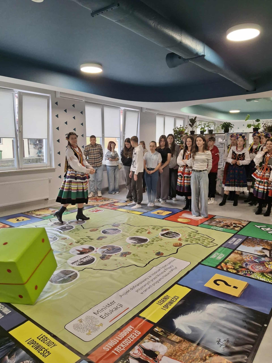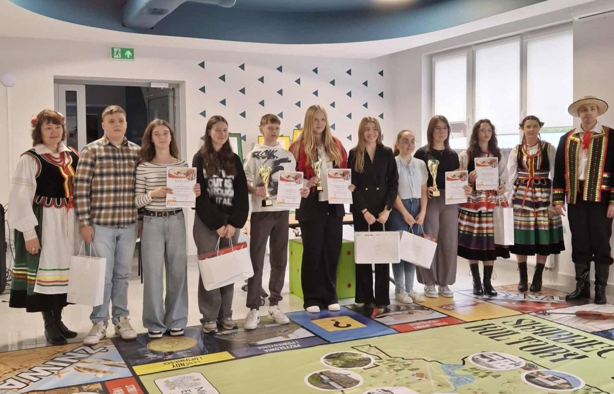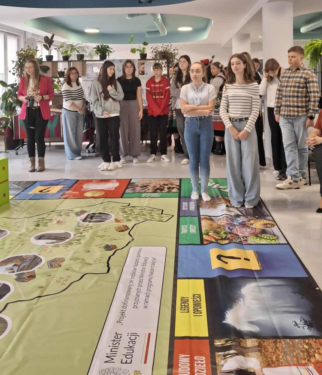 W dniu dzisiejszym w Gminnej Bibliotece Publicznej w Wojcieszkowie odbyło się wyjątkowe wydarzenie pod nazwą „Dzień Tradycji Wojcieszkowa”, projektu, którego celem było ocalenie od zapomnienia lokalnych zwyczajów, legend i tradycji regionu. Naszą szkołę reprezentowała pięcioosobowa delegacja uczniów wraz z panią Dyrektor. W pierwszej części wydarzenia zaprezentowano stroje ludowe przygotowane w ramach projektu – w tym damski strój wojcieszkowski, odtworzony na podstawie archiwalnych fotografii kobiet z Wojcieszkowa z około 1930 roku. Uroczystość uświetniły występy zespołów ludowych działających na terenie naszej gminy. Dziecięcy Zespół „Promyki” z Wólki Domaszewskiej zaprezentował tradycyjne tańce ludowe, natomiast Zespół „Świderzanki” ze Świderek oraz absolwentki szkół z gminy Wojcieszków zachwyciły publiczność śpiewem i gwarą ludową. O smakowite doznania kulinarne zadbały Panie z Koła Gospodyń Wiejskich w Wojcieszkowie, serwując tradycyjne potrawy regionalne. W drugiej części spotkania odbyła się rozgrywka gry planszowej „Skarbiec Kultury” w wersji wielkoformatowej, w której uczestniczyła młodzież ze szkół naszej gminy. Była to doskonała okazja do wspólnej zabawy, integracji oraz poznania bogactwa lokalnych tradycji, legend i obrzędów.