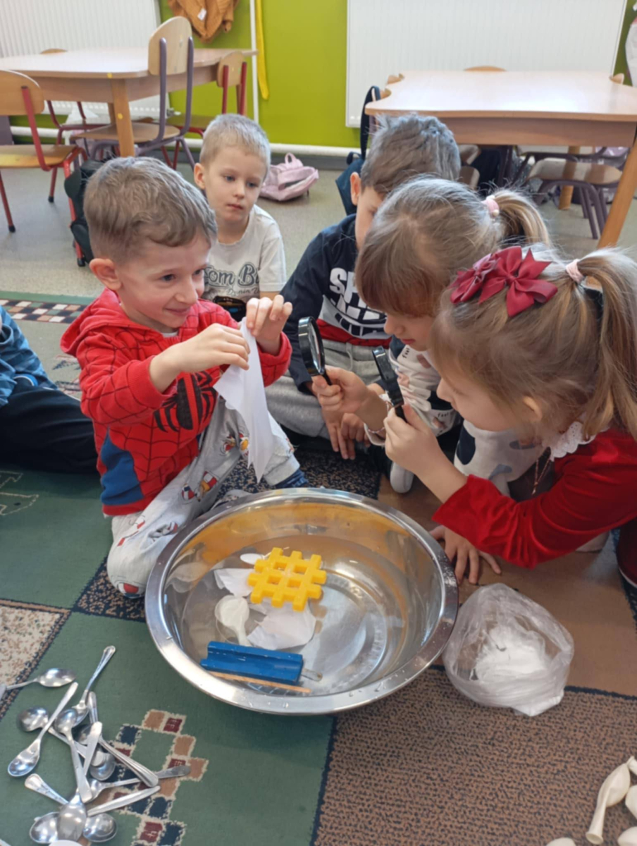 Dziś nasza grupa 5 i 6-latków z ogromnym zaangażowaniem i ciekawością realizowała kolejne zadania w ramach programu Mali Wielcy Odkrywcy - Poznajemy materiały.
