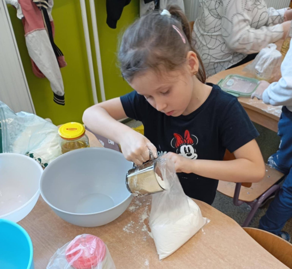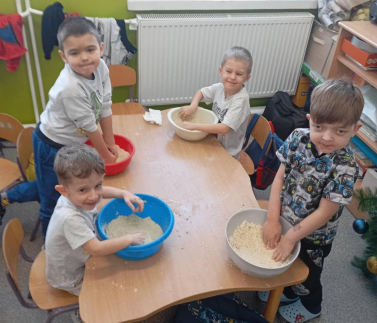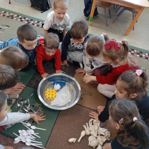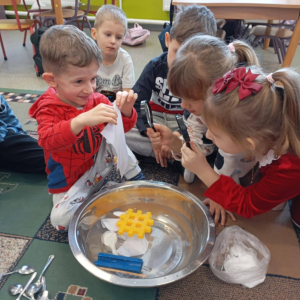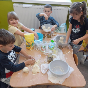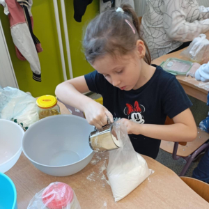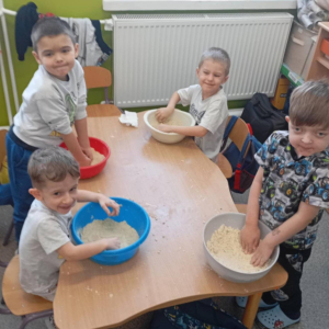 - przygotowały piasek kinetyczny – doskonaląc sprawność manualną i ucząc się, jak poprzez mieszanie składników zmieniają się ich właściwości,