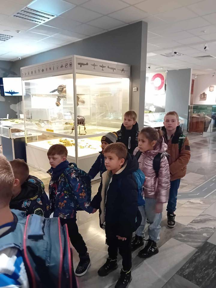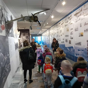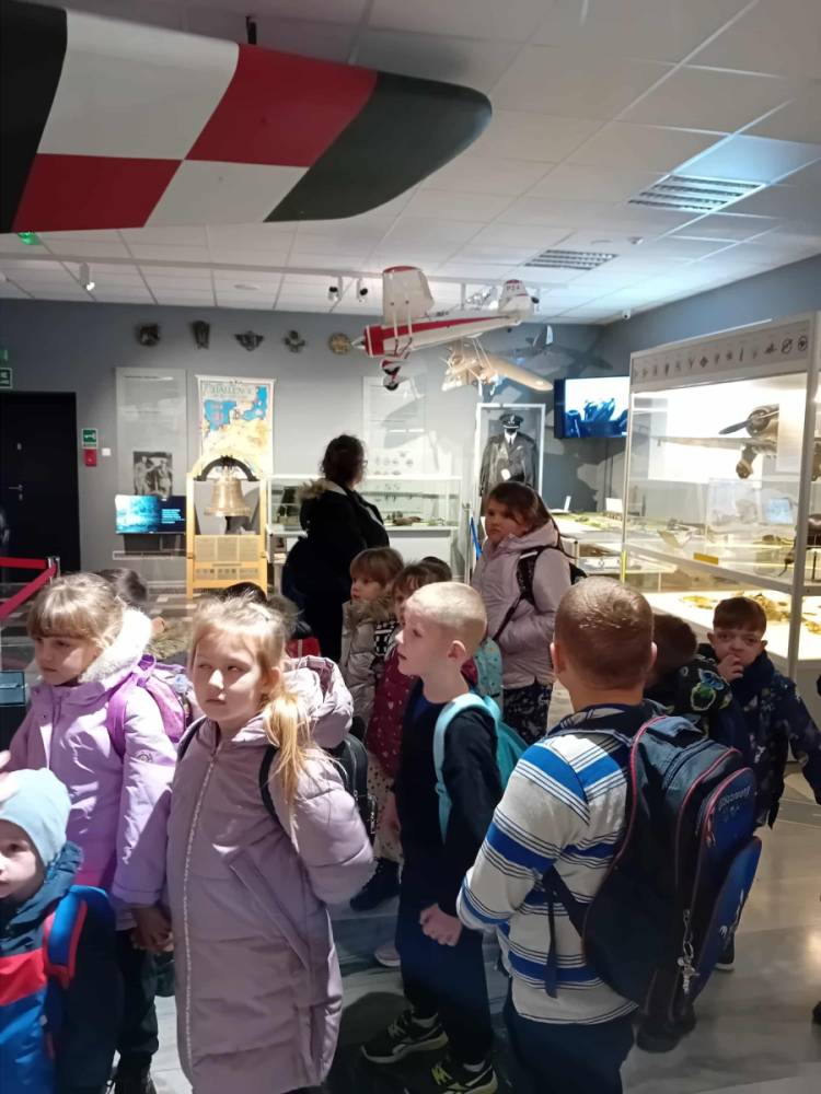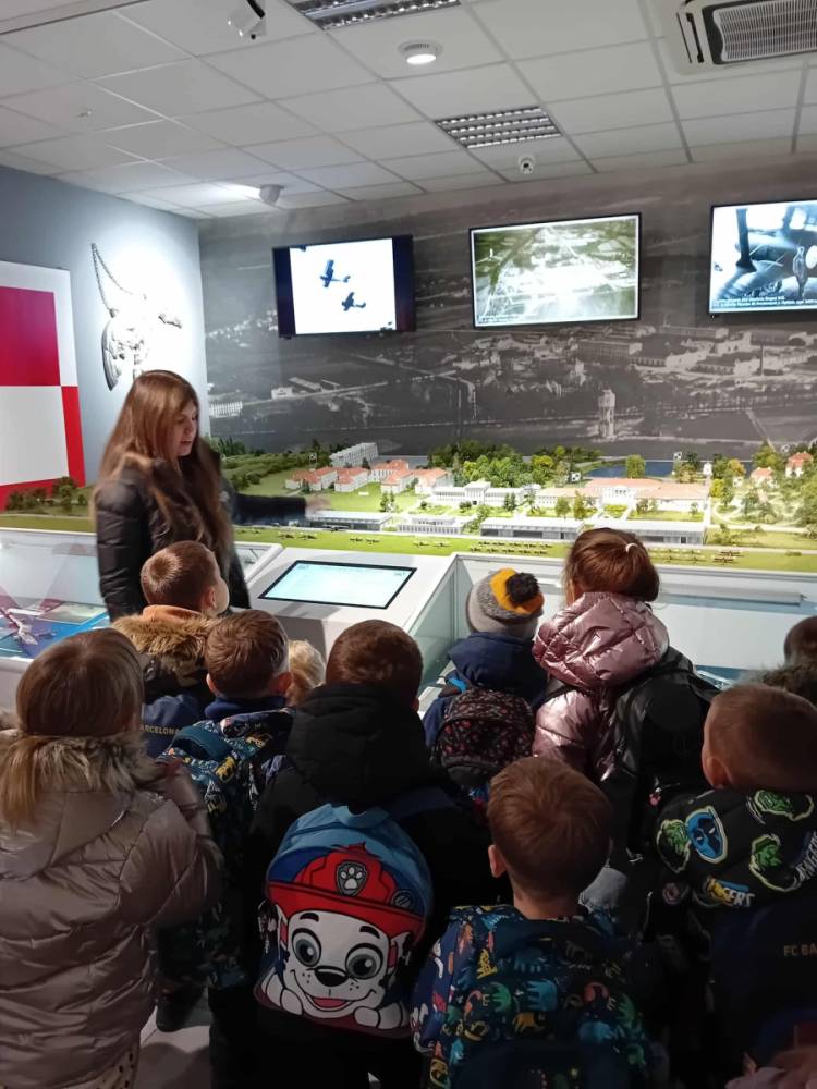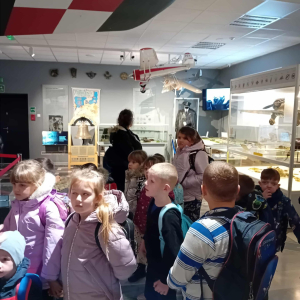 Po lekcji muzealnej przewodniczka oprowadziła uczniów po wystawach, omawiając zgromadzone eksponaty oraz wyjaśniając znaczenie symboli lotniczych. Dzieci z zainteresowaniem słuchały opowieści o historii polskiego lotnictwa i codzienności pilotów.