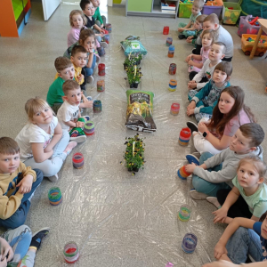 Najmłodsi z wielkim zaangażowaniem zabrali się również za wiosenne sadzenie kwiatów. Dzięki ich pracy sala lekcyjna nabrała prawdziwie wiosennego wyglądu. Nie mogło zabraknąć pamiątkowych zdjęć z Panią Wiosną, które zachowają wspomnienia tego radosnego dnia.