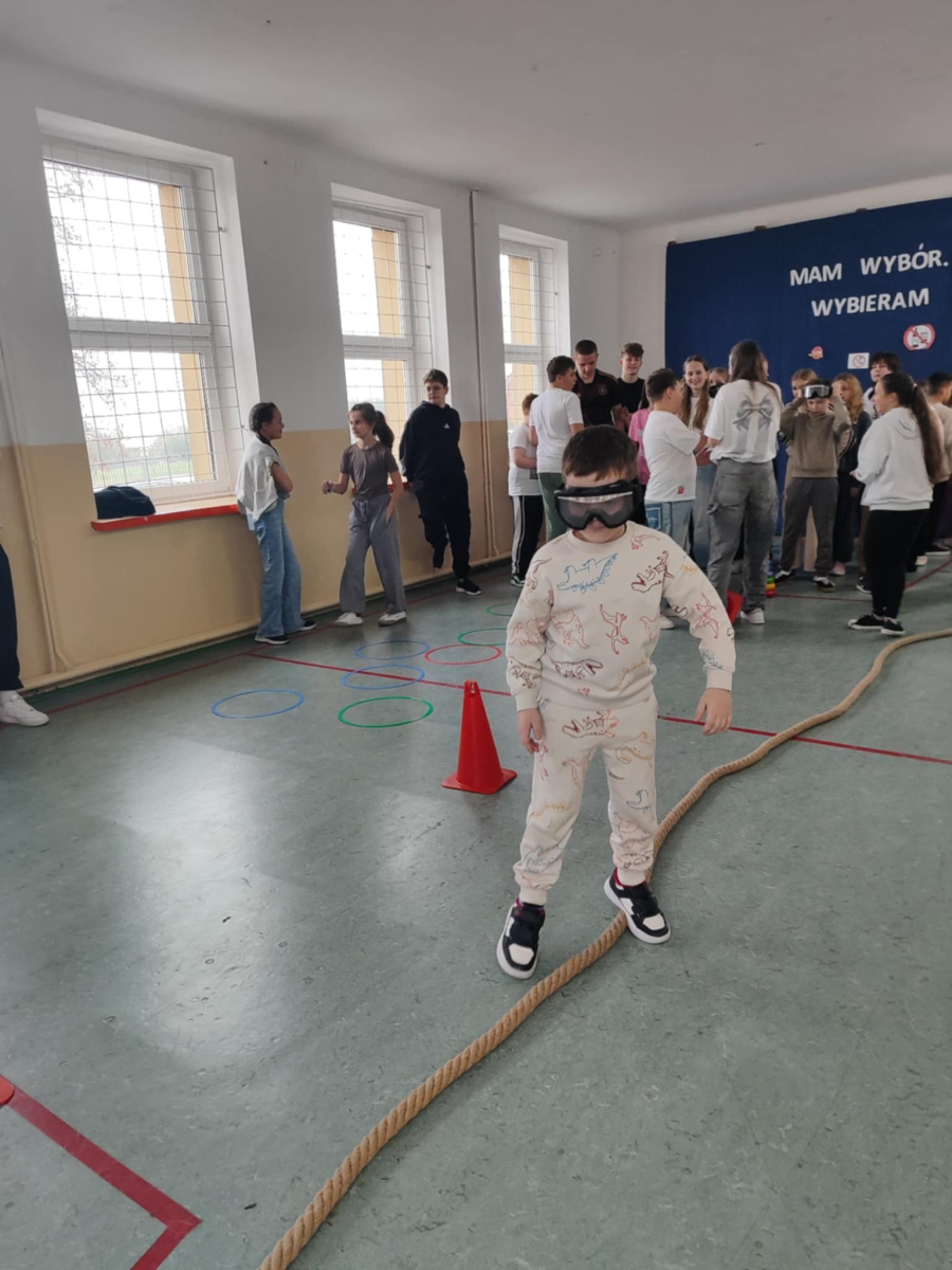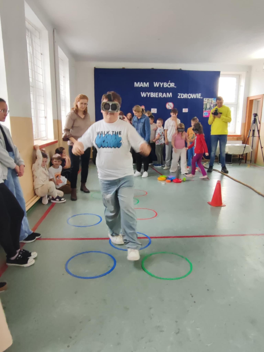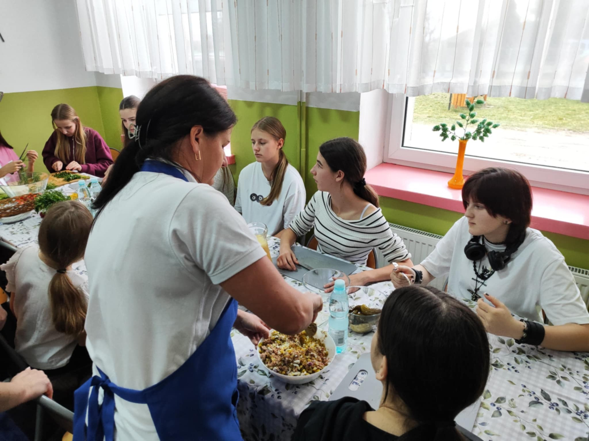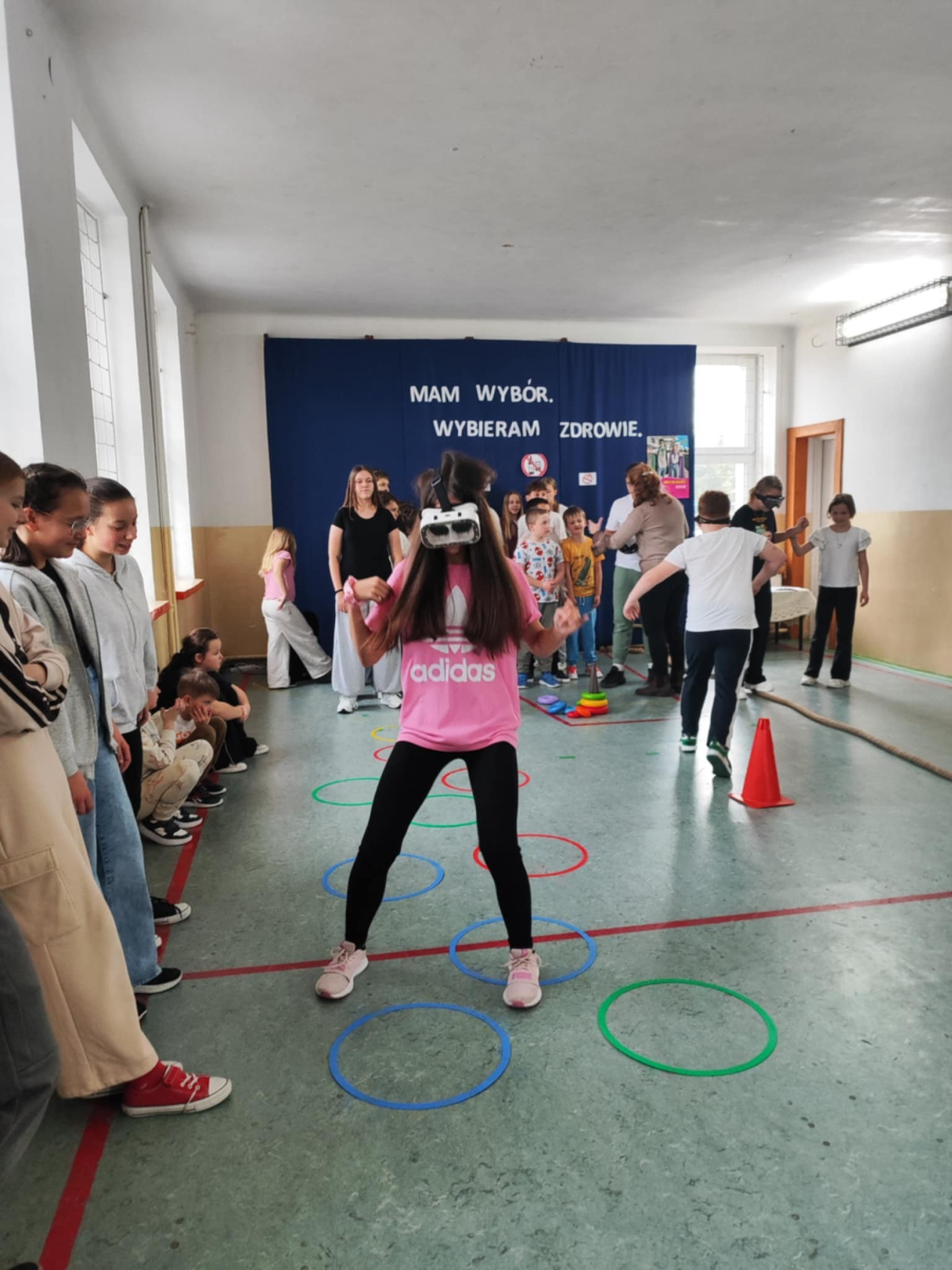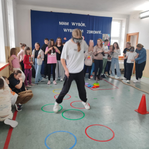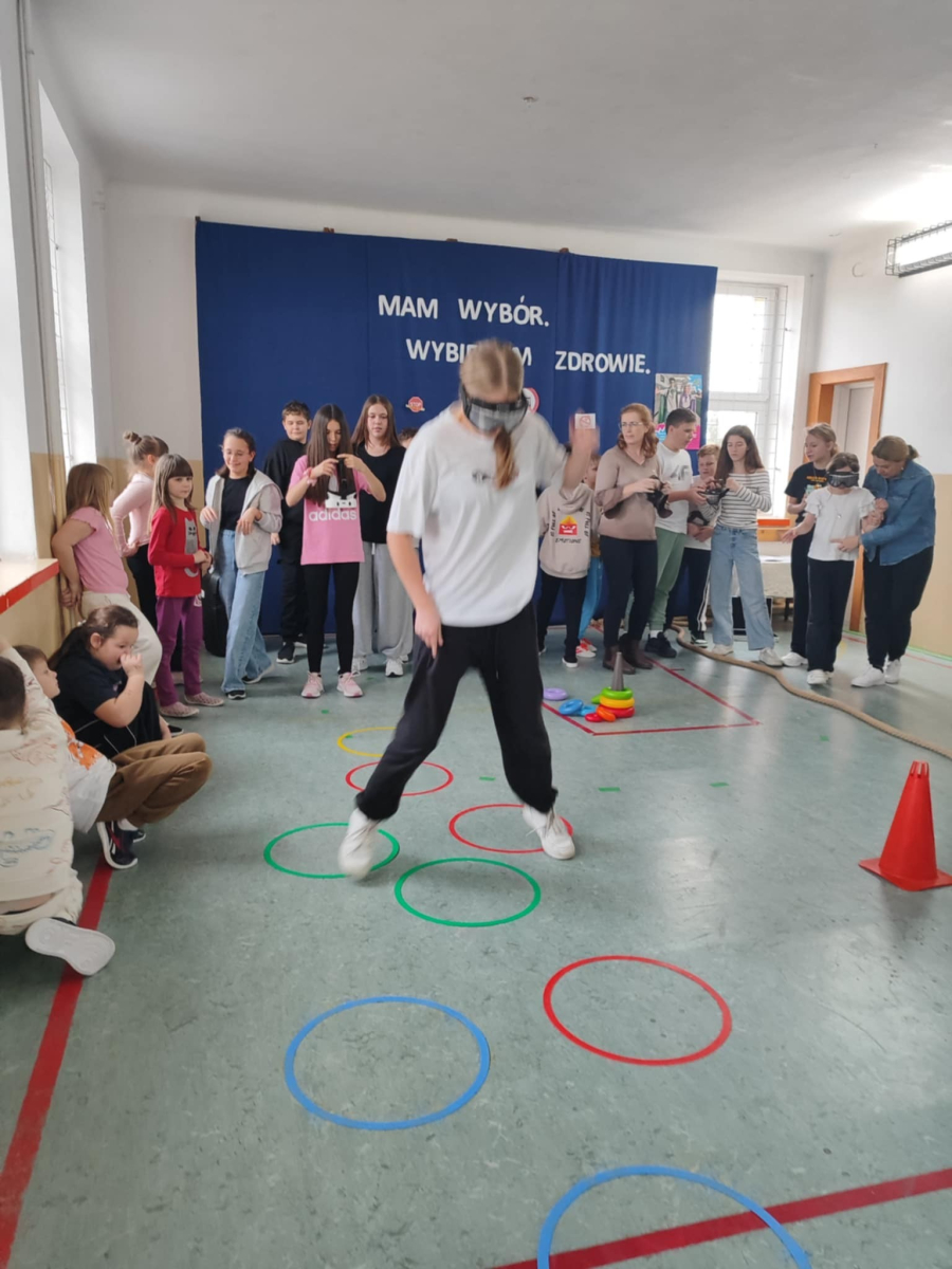 której celem była aktywizacja i wzmocnienie współpracy w grupie. Następnie odbyła się część teoretyczna, podczas której młodzież zdobywała wiedzę na temat szkodliwości palenia papierosów, spożywania alkoholu oraz napojów energetycznych. Wspólnie obejrzeliśmy filmy profilaktyczne, a uczniowie pracowali z Kartami pracy, utrwalając zdobytą wiedzę. Przygotowaliśmy również dla nich ulotki profilaktyczne dotyczące negatywnych skutków palenia i picia alkoholu. Ważnym punktem spotkania były warsztaty z wykorzystaniem alkogogli i narkogogli, dzięki którym uczniowie mogli w bezpieczny sposób, doświadczyć”, jak substancje psychoaktywne zaburzają funkcjonowanie człowieka, wpływając na koordynację, koncentrację i percepcję. Ostatnia część zajęć miała charakter kulinarny i prozdrowotny. Panie z Koła Gospodyń Wiejskich „Jagódki” w Oszczepalinie Pierwszym poprowadziły