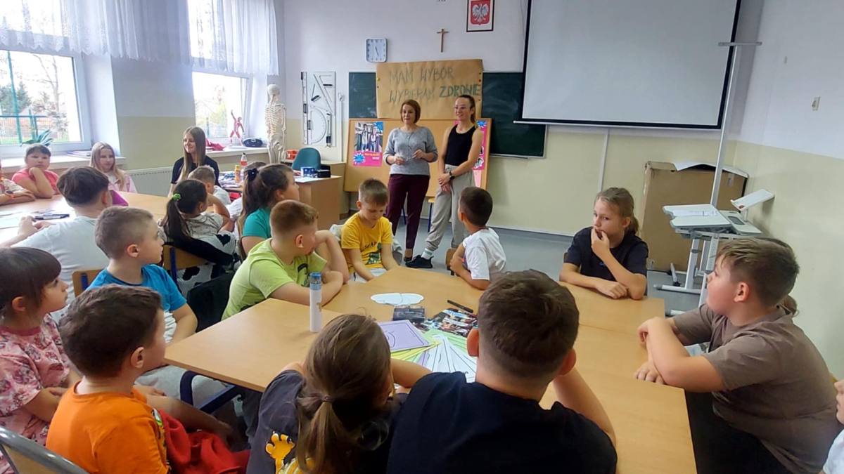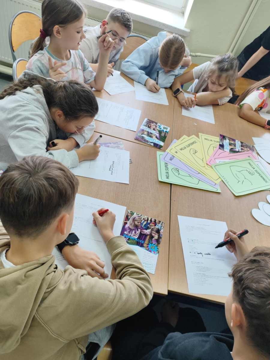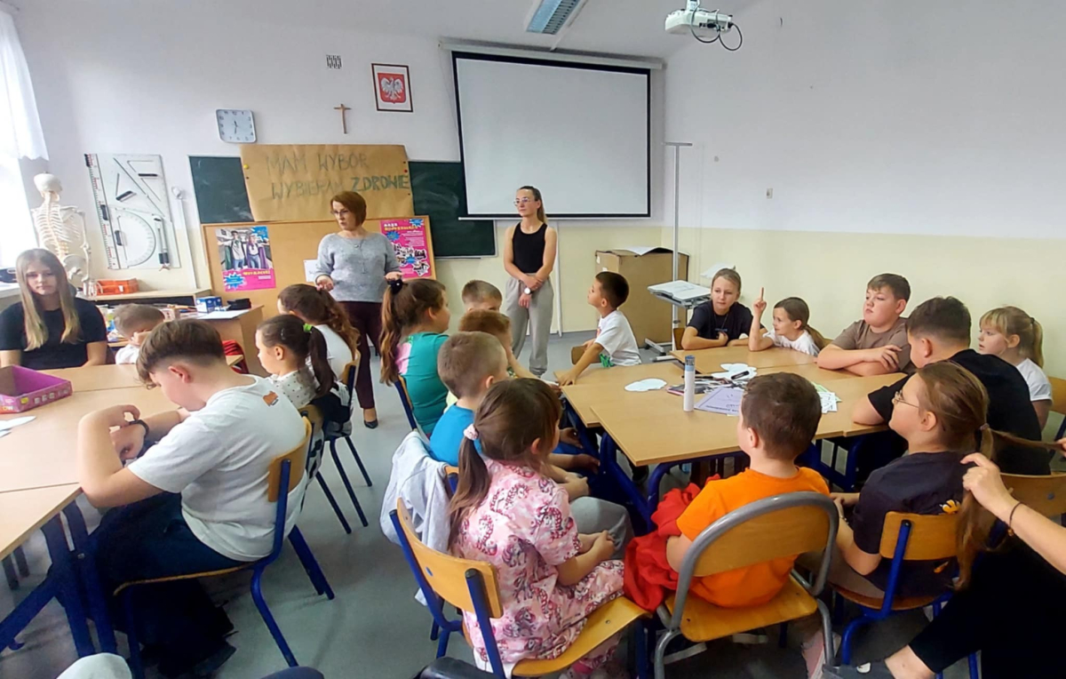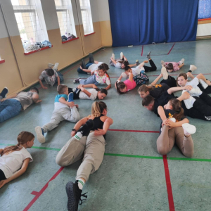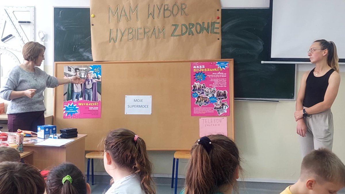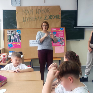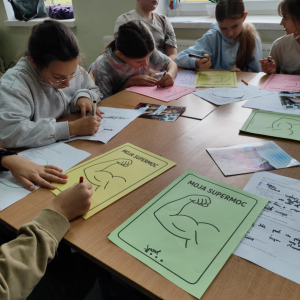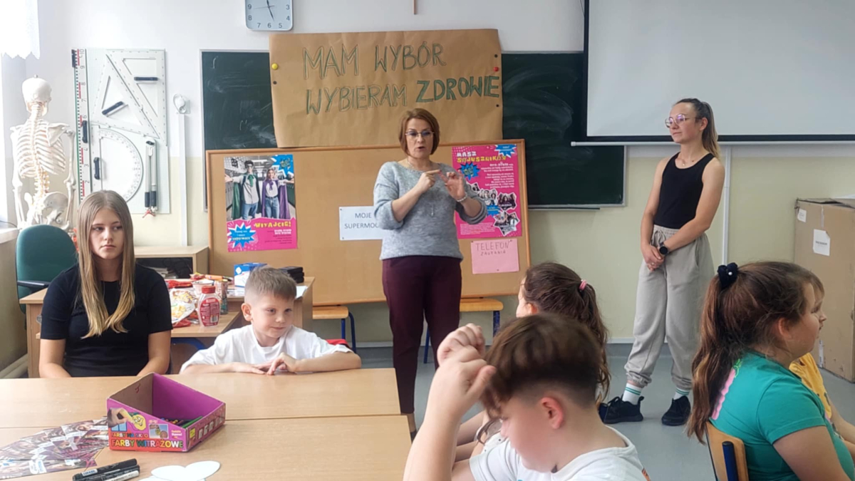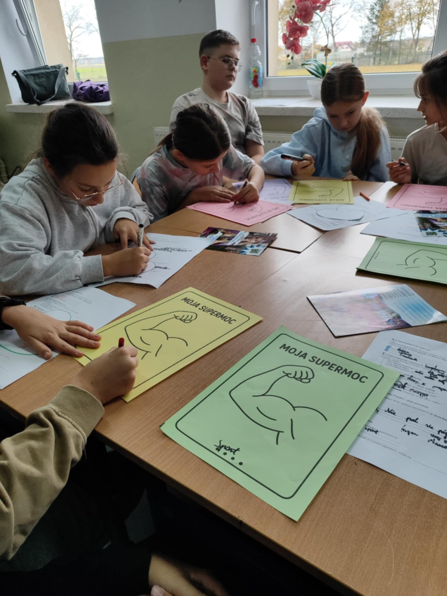 W naszej szkole odbyło się kolejne spotkanie w ramach realizacji szkolnego programu profilaktycznego „Mam wybór. Wybieram zdrowie”. Zajęcia obejmowały trzy części, które łączył wspólny cel – wzmacnianie postaw prozdrowotnych i profilaktyka uzależnień. Na początku zaprosiliśmy uczniów do wspólnej zabawy ruchowej i ćwiczeń inspirowanych ruchem zwierząt – tzw. Animal Flow. Ten rodzaj treningu pomaga wzmacniać całe ciało, poprawia koordynację oraz świadomość własnego ciała. Następnie uczniowie uczestniczyli w ćwiczeniach oddechowych i rozciągających, które pozwoliły zadbać o równowagę psychiczną i relaks.W drugiej części spotkania uczniowie poznali „bohaterów” kampanii ,,Młodzi, trzeźwi” – Ritę i Rogera. Wspólnie poszukiwali swoich supermocy i sojuszników w trudnych sytuacjach życiowych. Pomocą w pracy były przygotowane karty zadań, plakaty oraz ulotki przekazane przez Gminną Komisję Rozwiązywania Problemów Alkoholowych i Przeciwdziałania Narkomanii w Wojcieszkowie. Efektem wspólnej pracy była Tablica Supermocy, która pokazuje, jak nasze mocne strony pomagają w codziennym życiu i w profilaktyce uzależnień.