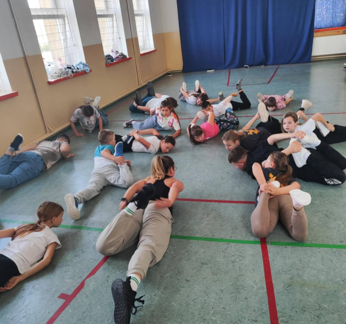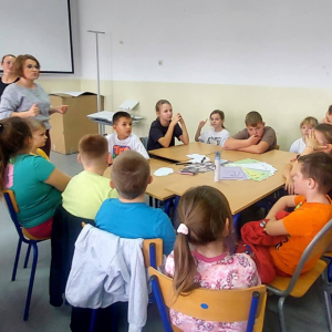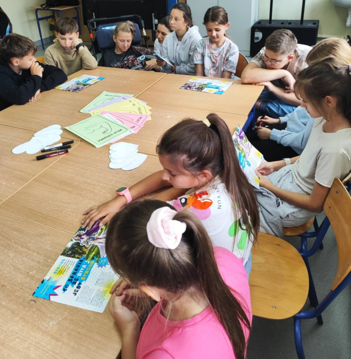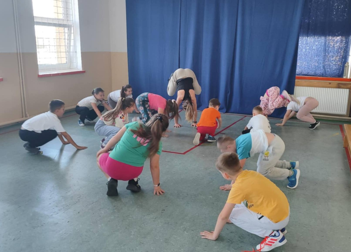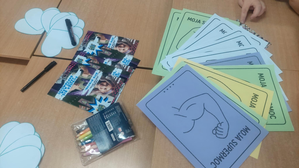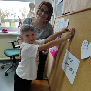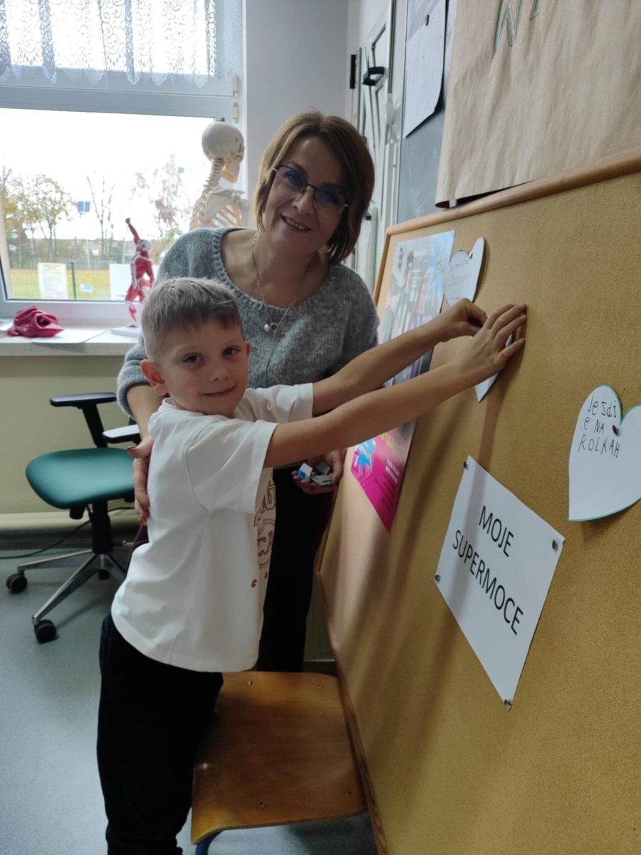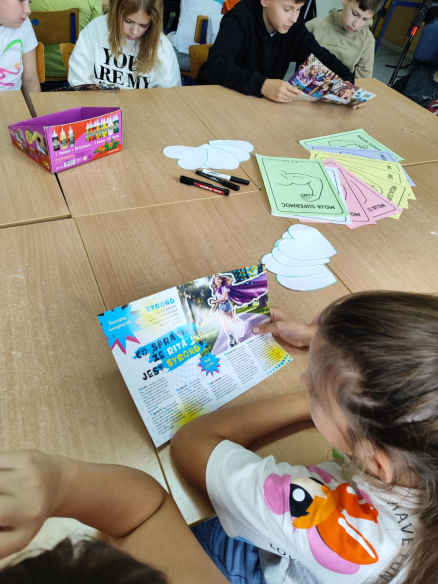 W naszej szkole odbyło się kolejne spotkanie w ramach realizacji szkolnego programu profilaktycznego „Mam wybór. Wybieram zdrowie”. Zajęcia obejmowały trzy części, które łączył wspólny cel – wzmacnianie postaw prozdrowotnych i profilaktyka uzależnień. Na początku zaprosiliśmy uczniów do wspólnej zabawy ruchowej i ćwiczeń inspirowanych ruchem zwierząt – tzw. Animal Flow. Ten rodzaj treningu pomaga wzmacniać całe ciało, poprawia koordynację oraz świadomość własnego ciała. Następnie uczniowie uczestniczyli w ćwiczeniach oddechowych i rozciągających, które pozwoliły zadbać o równowagę psychiczną i relaks.W drugiej części spotkania uczniowie poznali „bohaterów” kampanii ,,Młodzi, trzeźwi” – Ritę i Rogera. Wspólnie poszukiwali swoich supermocy i sojuszników w trudnych sytuacjach życiowych. Pomocą w pracy były przygotowane karty zadań, plakaty oraz ulotki przekazane przez Gminną Komisję Rozwiązywania Problemów Alkoholowych i Przeciwdziałania Narkomanii w Wojcieszkowie. Efektem wspólnej pracy była Tablica Supermocy, która pokazuje, jak nasze mocne strony pomagają w codziennym życiu i w profilaktyce uzależnień.