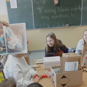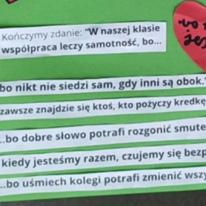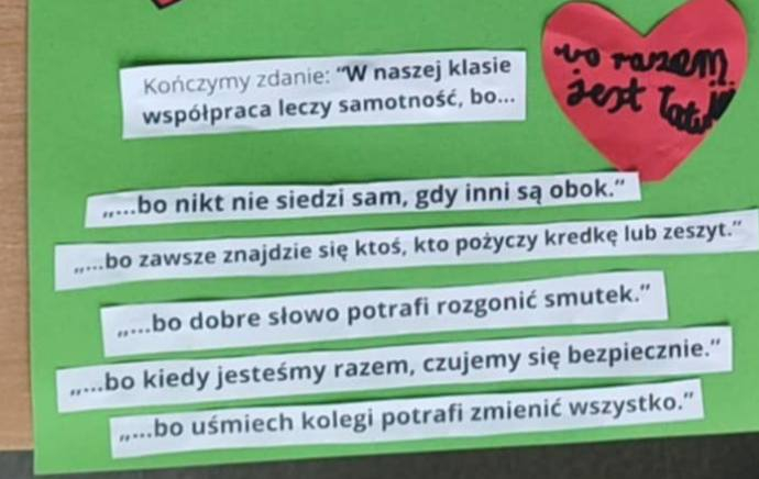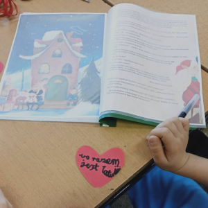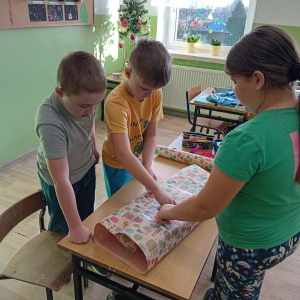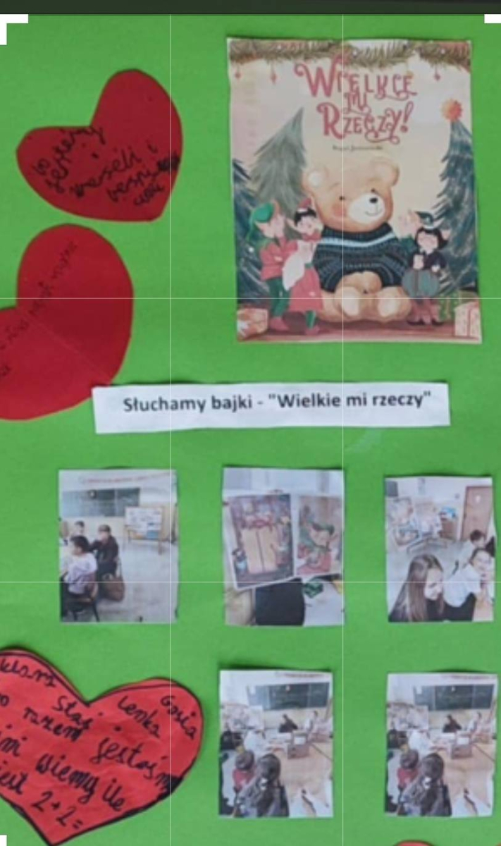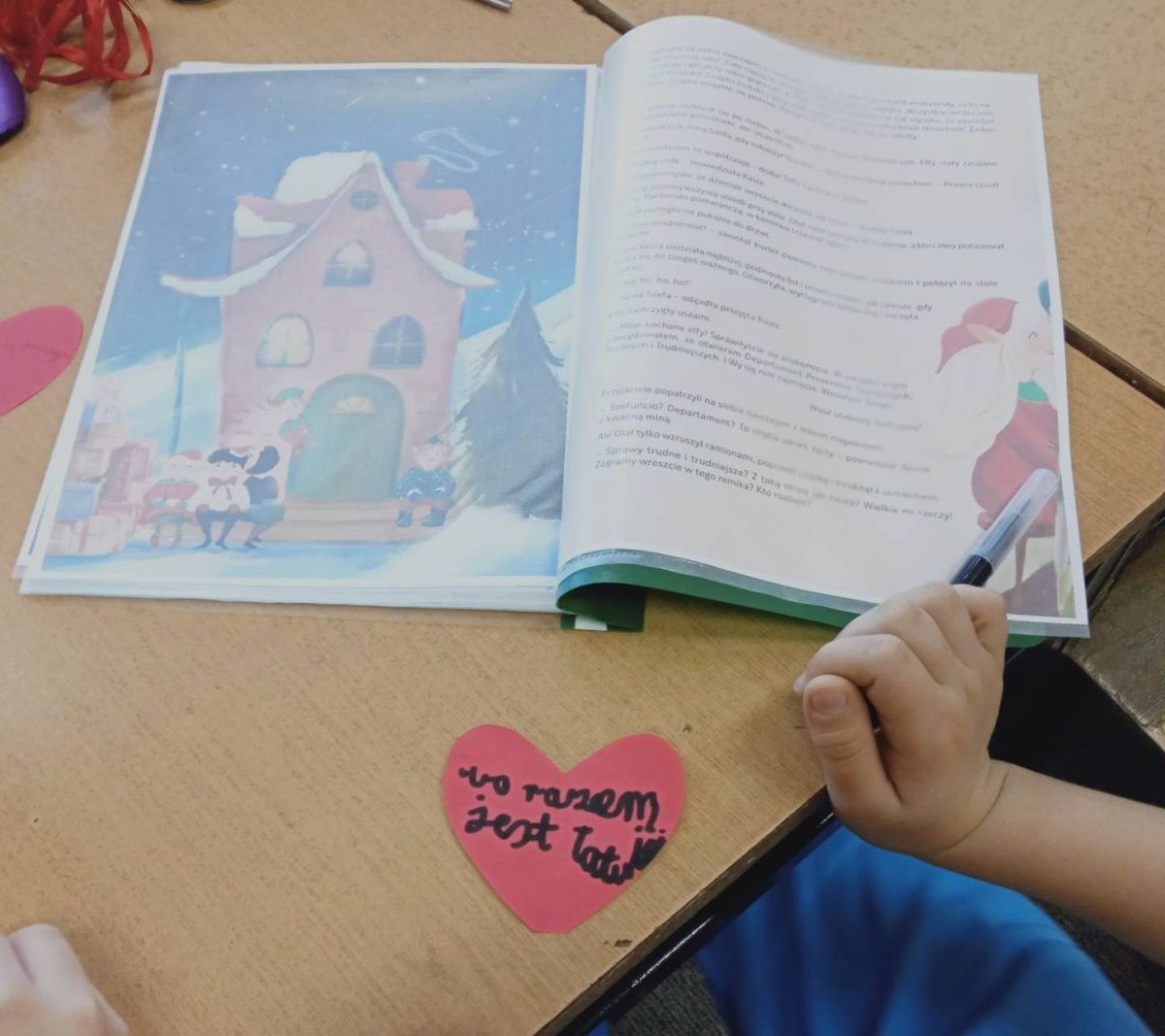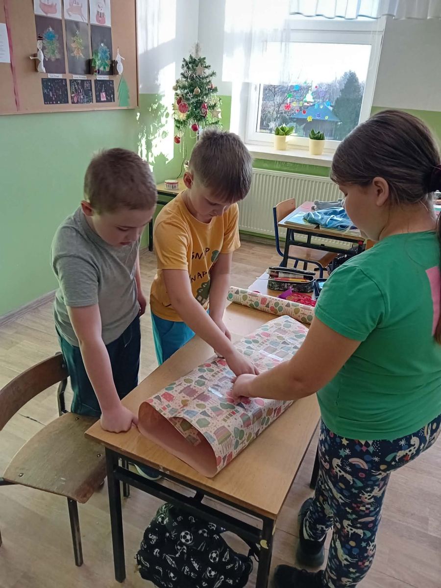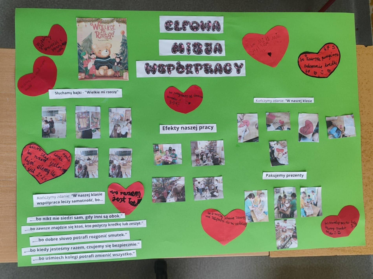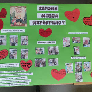 Uczniowie klas I–III włączyli się w ogólnopolską akcję czytelniczą „Elfowa Misja Współpracy”, której celem jest uczenie dzieci empatii, wzajemnej pomocy i działania zespołowego poprzez bajki. W ramach akcji dzieci wspólnie wysłuchały bajki pt. „Wielkie mi rzeczy”, a następnie, zgodnie ze scenariuszem, bajkoterapeutycznym – uczestniczyły w zajęciach rozwijających umiejętność współpracy. Uczniowie pracowali razem, rozmawiali o emocjach bohaterów, uczyli się dostrzegać potrzeby innych oraz szukać rozwiązań, które służą całej grupie. Kolejnym elementem działań było wspólne przygotowanie prezentów. Każda aktywność była zaplanowana tak, aby dzieci musiały współdziałać, dzielić się zadaniami i pomagać sobie nawzajem. Uczniowie tworzyli także własne dokończenia hasła: ,,W naszej klasie współpraca leczy samotność, bo…”