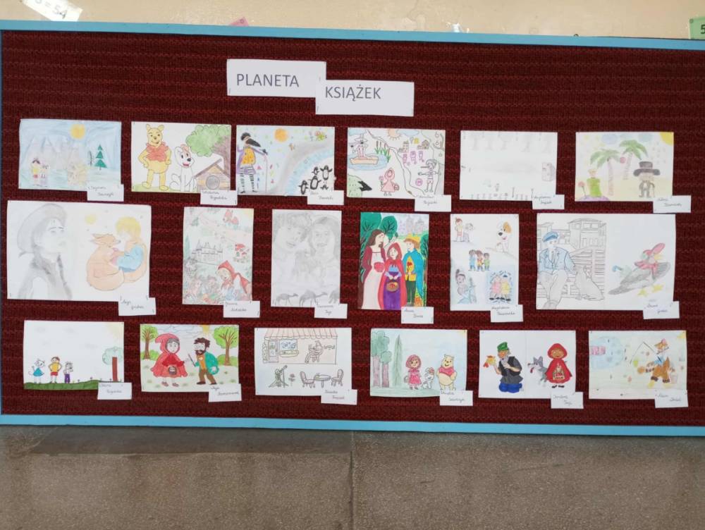 sięgania po literaturę i udowadniają, że książka wciąż ma dla nich wyjątkową wartość. Jedną z takich inicjatyw jest Ogólnopolski Konkurs Plastyczny dla szkół podstawowych, którego celem — oprócz promocji czytelnictwa — jest rozwijanie kreatywności oraz umiejętności artystycznych dzieci i młodzieży.Do udziału w konkursie zaproszono uczniów z całego kraju. Nasza szkoła również aktywnie włączyła się w to wydarzenie — dowodem jest aż 17 pięknych prac, które przygotowali zarówno młodsi, jak i starsi uczniowie. Każda z nich przedstawia ulubionych bohaterów literackich, pokazując, że książki rzeczywiście inspirują! Jesteśmy dumni z kreatywności naszych uczniów i cieszymy się, że z taką pasją angażują się w działania, które rozwijają ich talenty oraz promują czytelnictwo. Gratulujemy wszystkim uczestnikom konkursu. #PlanetaKsiążek #KonkursPlanetaKsiążek