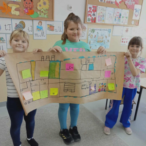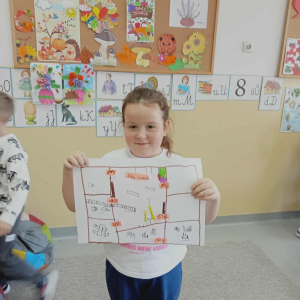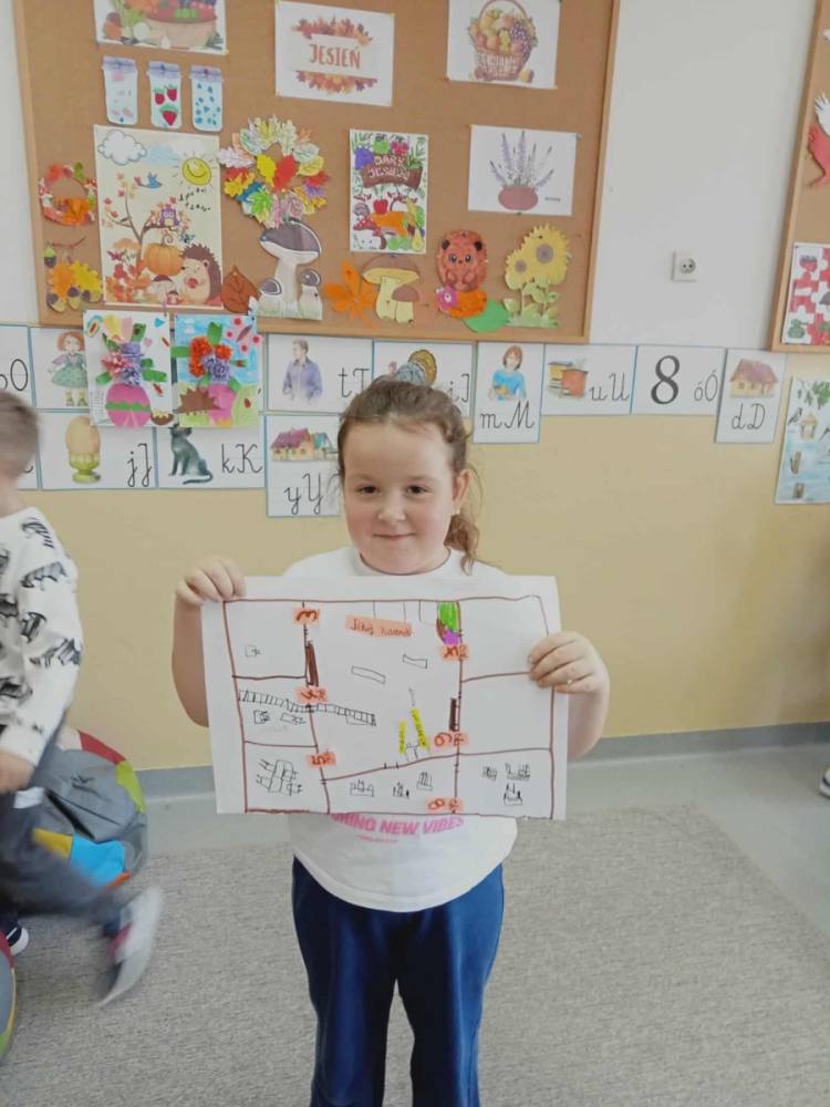 Podczas zajęć dzieci poznały takie pojęcia jak: plan, kierunek, droga. Uczyły się określać położenie przedmiotów i pomieszczeń względem siebie oraz odkryły, że plan to rysunek widziany z góry, który pomaga zorientować się, gdzie coś się znajduje.
